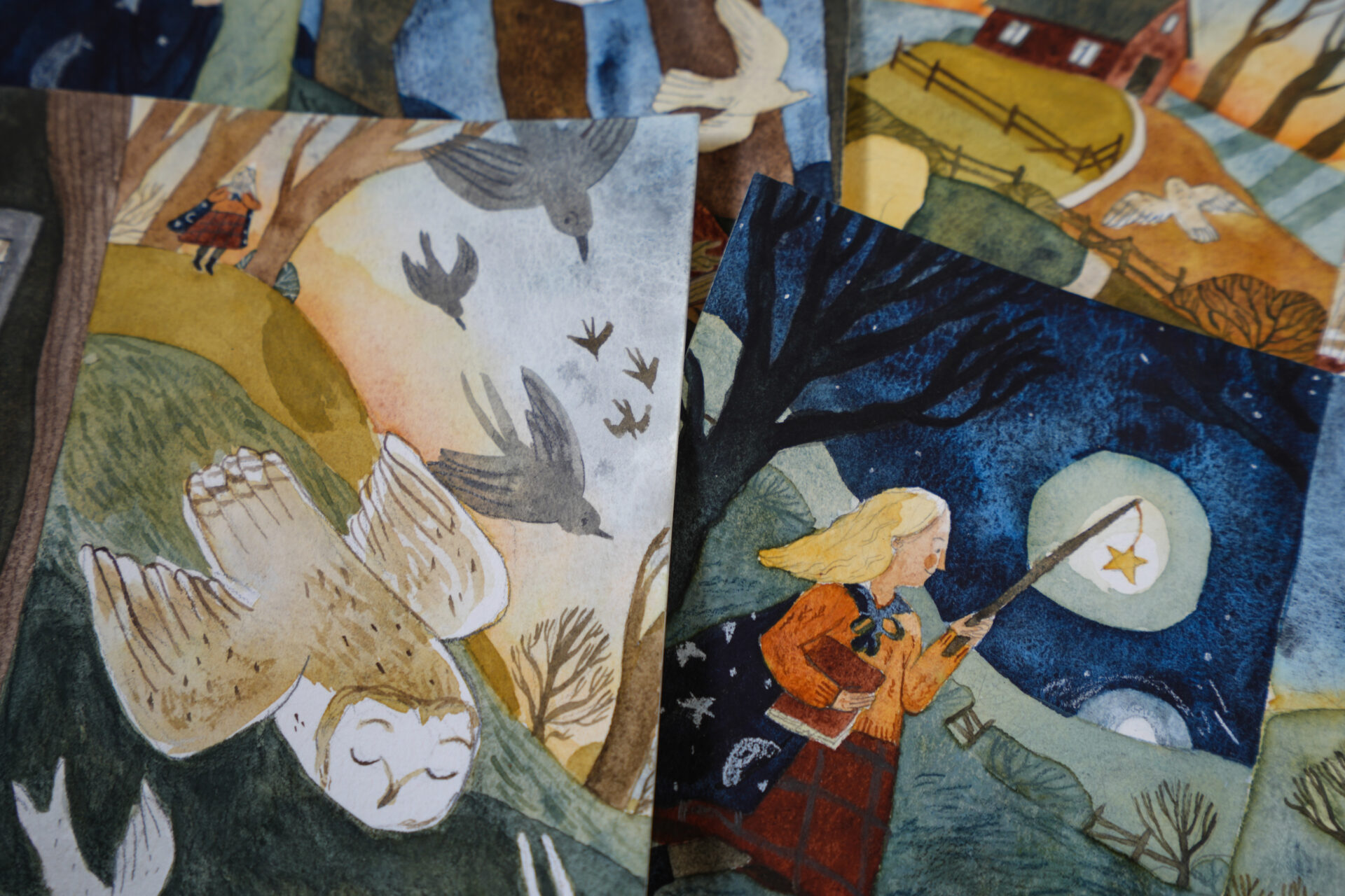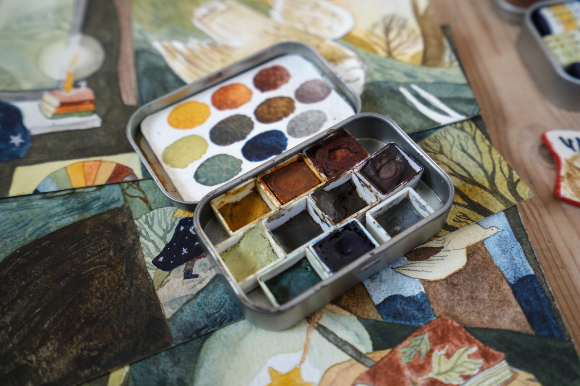 Autumn is my favourite season, it’s the celebration of golden hours, fresh air, deep shadows, and cosy living. When you feel the Autumn season is gone, after a brief pause, it starts again on the other side of the world. The colours I picked for this palette could be used to paint Autumn, or if you enjoy using warm/ muted colours, this could be a lovely choice for other subject matters like cosy indoors, birds, flowers, and landscapes. I love granulating watercolours, so I tried to include some which could bring a little magic to a page. This set allows you to mix and explore as well as use colours as they are. There are primary, secondary colours with a little twist, as well as 2 browns, 1 grey, and my soul colour -Butterfly.