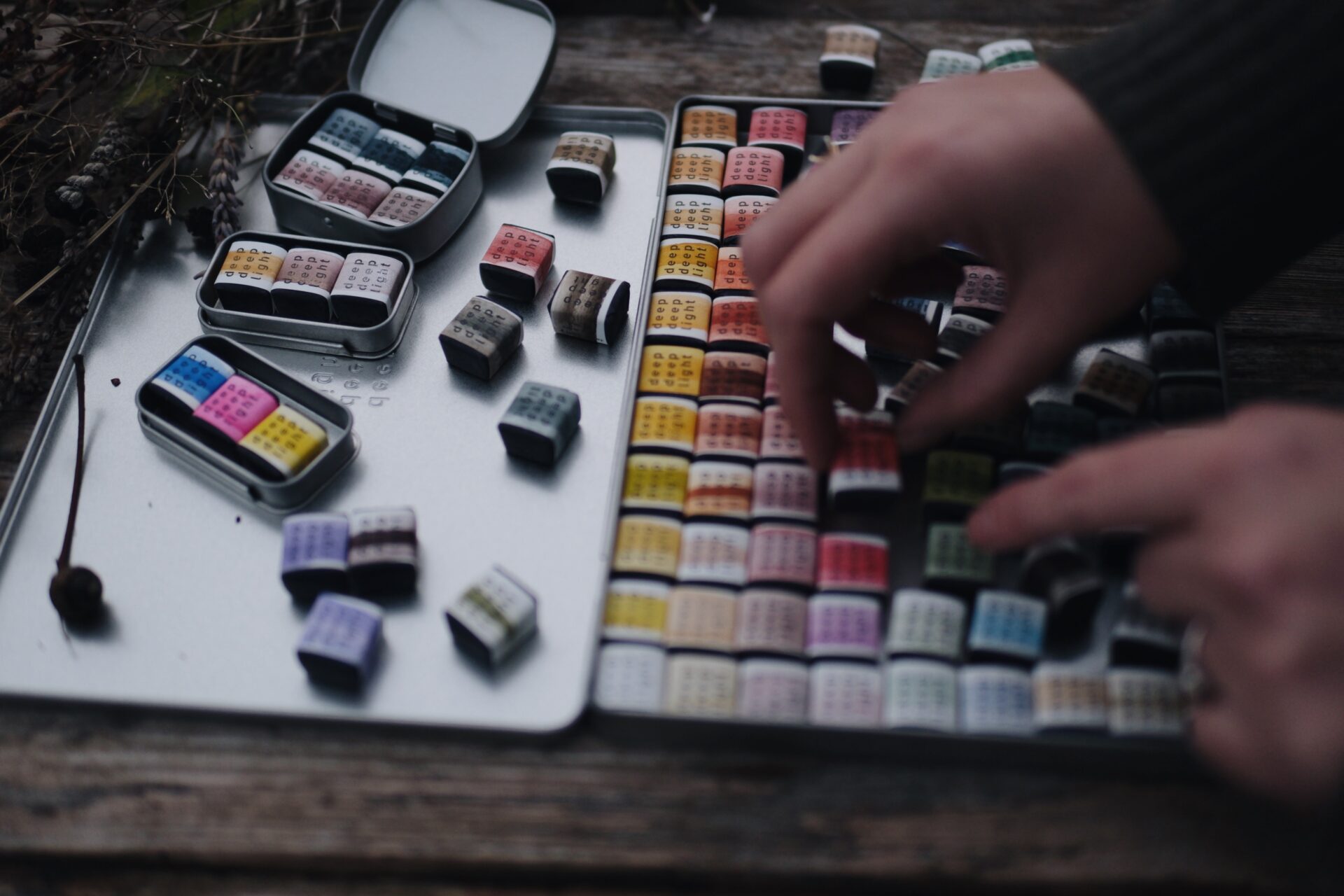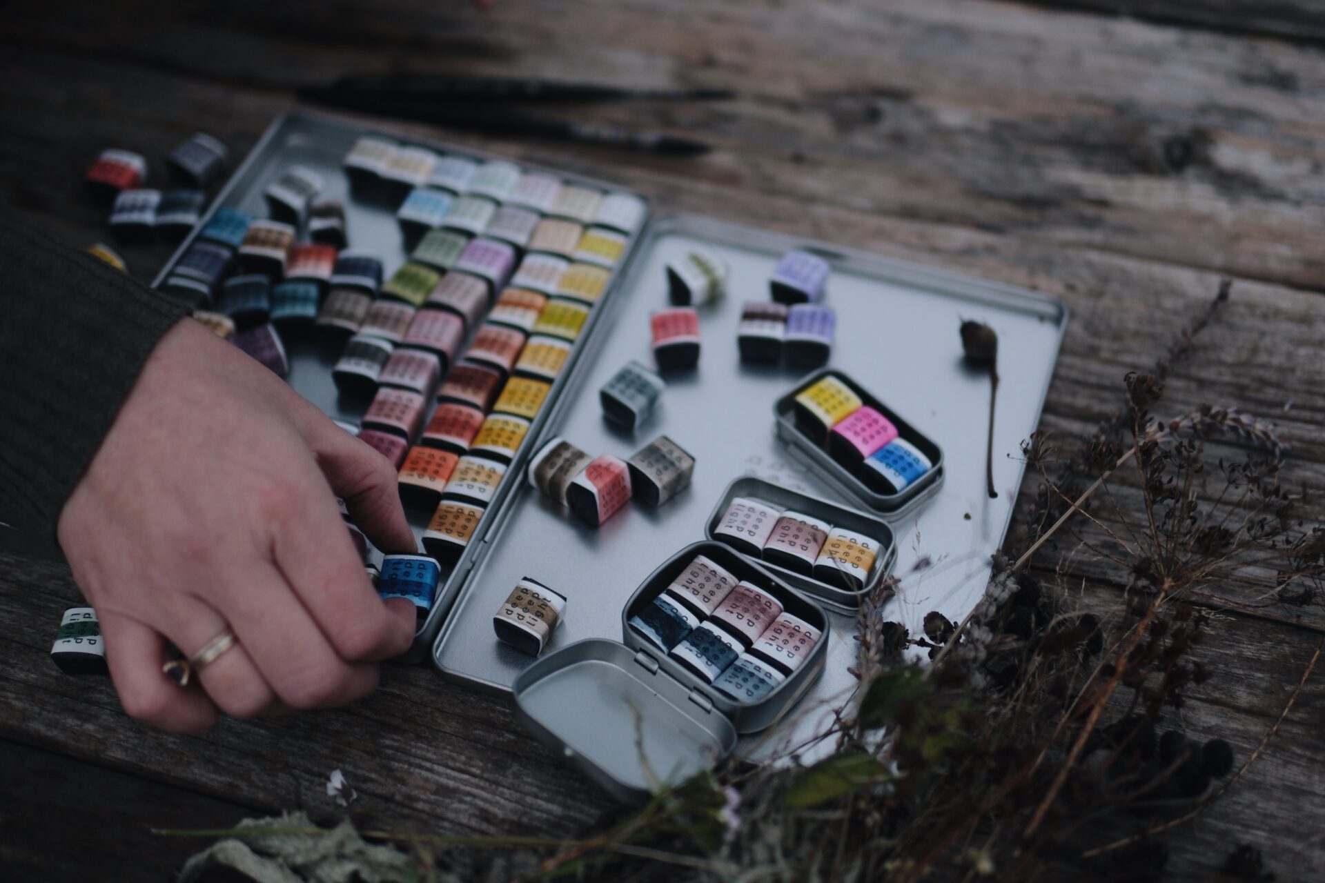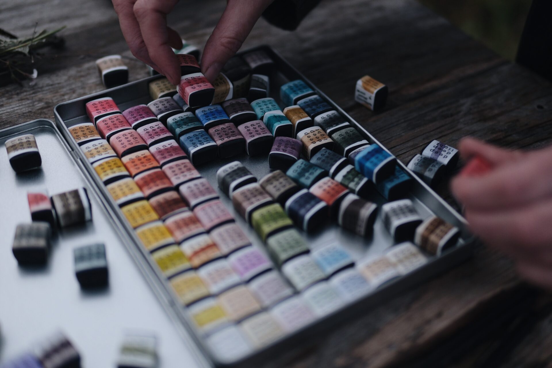 We work with pigments that are lightfast, environmentally friendly, and human-friendly. We also test all mixes. Tests show they are grade 6-8 (from 8, which means that art with our watercolors will last at least 50 years (grade 6 – all with zinc) up to more than 200 years (grade 8). All our watercolors are handmade from pigment or pigment mixes, binders, and essential oils as conservative. The binder is made by ourselves from gum arabic, natural honey and/or glycerine, and water. Our watercolors have a flowery scent, with lemongrass as the top note and sandalwood as the base note