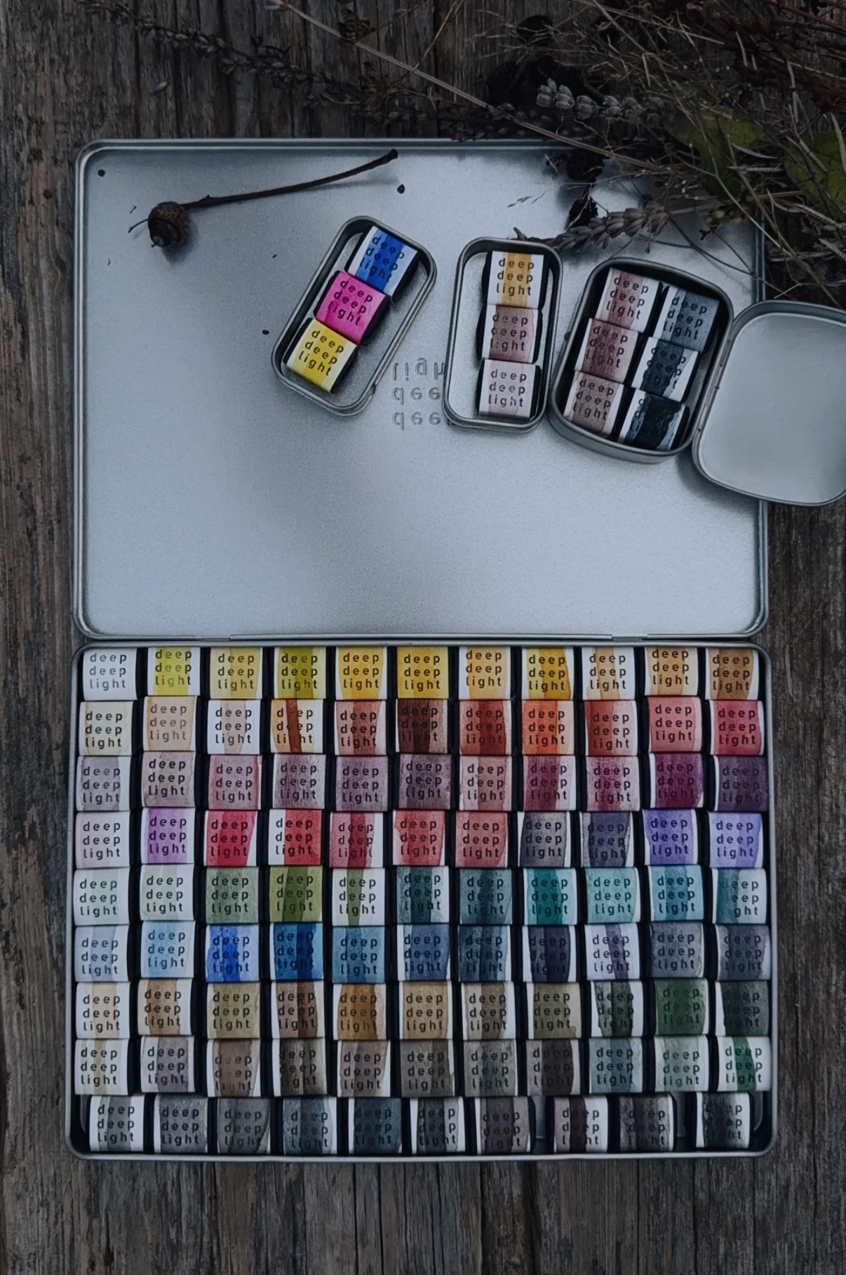 Our joy and happiness – full set of 110 DeepDeepLights. This is a collection of our work since the beginning of DeepDeepLight. We create all colors for ourselves or people close to us and our brand. This is our soul, our emotions, feelings, humming, our joy, and living the best life possible on this planet. This is a tribute to our nature – fields, forests, gardens, birds and trees, flowers, sky, our sea, and of course Mother Earth. This beauty is created from both classical natural earth pigments and also contemporary pigments made by humans. We honor watercolor-making artisanal practice but our wild and free souls live in the 21st century, so we enjoy everything possible now. Here is our full catalog.