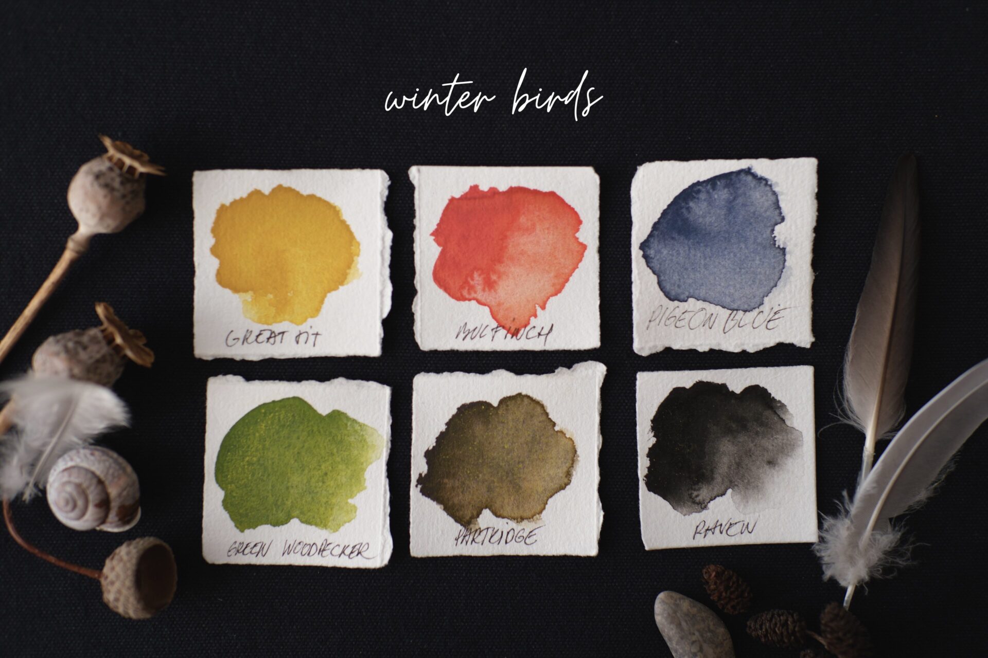 Winter bird collection was inspired by birds that do not migrate to the south during the cold season in the Baltics. When everything in nature is monochrome birds are the ones that really stand out and look incredibly bright. When colors are mixed we get a winterly pastel palette that was our initial intention for the winter collection. This set can be used as the only set you need for your winter nature explorations. Or it can be used with other watercolors if you want to mute colors down.